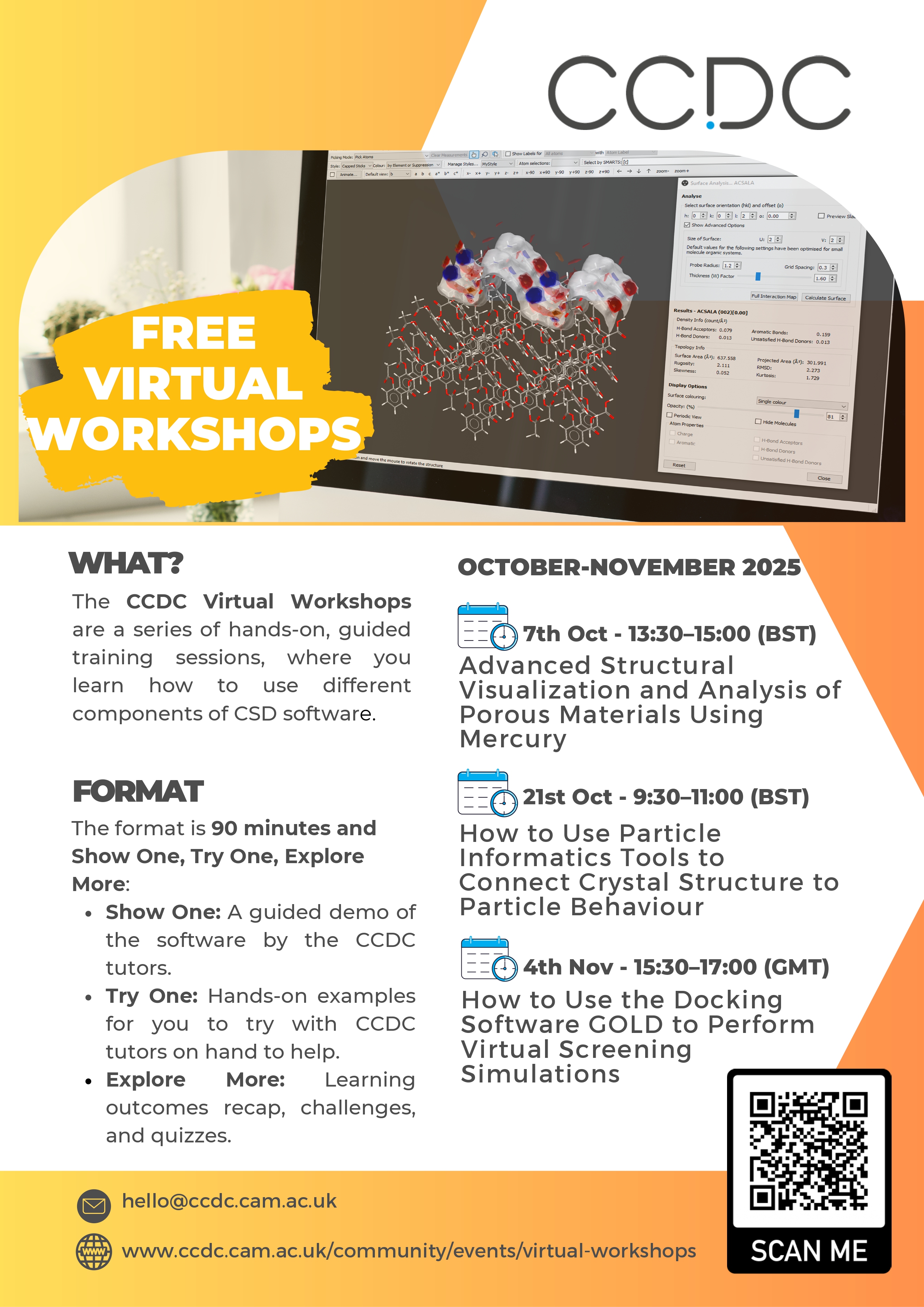 Кембрички центар кристалографских података (Cambridge Crystallographic Data Centre, CCDC) наставља са серијом виртуалних радионица ове јесени. CCDC је непрофитна организација чија је главна активност одржавање Кембричке базе структурних података (Cambridge Structural Database, CSD). CSD је највећа база кристалних структура на свету; она тренутно садржи преко 1,35 милиона кристалних структура координационих, органских и органометалних једињења.